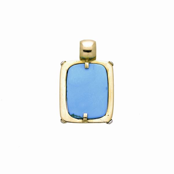 MATERIAL: yellow gold, diamonds and turquoise DESCRIPTION: rectangular pendant embellished with rectangular cabochon-cut turquoise mounted in yellow gold and heightened on the sides with diamonds MEASUREMENTS: cm 2.5x 4.0h WEIGHT: gr 15.0