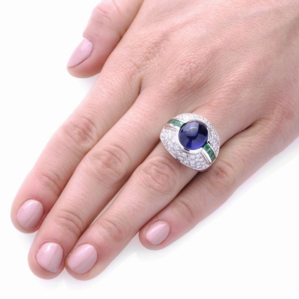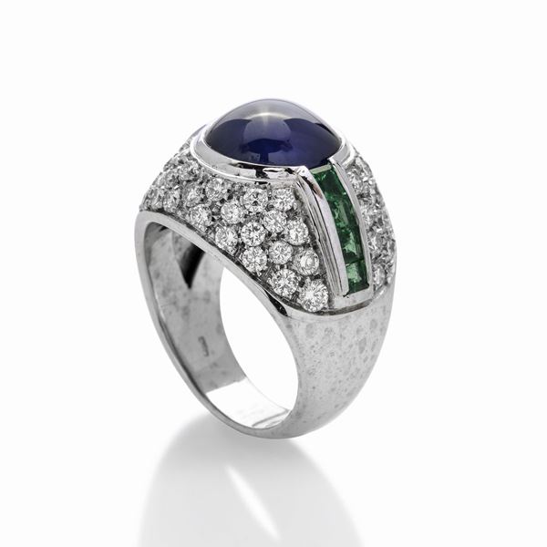 MATERIAL: white gold, diamond, emeralds and sapphire DESCRIPTION: rounded band ring made with oval cabochon-cut sapphire framed on the sides by carrè-cut emeralds on a base with brilliants pave, bears the 750 mark MEASURES: 7.75 ring WEIGHT: sapphire ct 6.50, diamonds ct 2.0, emerald ct 0.60, gr 15