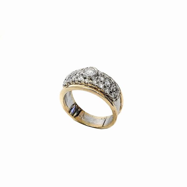 MATERIAL: white gold, yellow gold and diamonds DESCRIPTION: band ring made with a brilliant-cut diamond in the center, entirely embellished with a brilliant pave, bears the 750 mark MEASURES: 6 ring WEIGHT: diamonds ct approx.1.20, gr 7.0