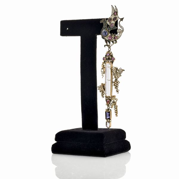 MATERIAL: low title gold, micro-pearls, rock crystal, sapphires and rubies DESCRIPTION: Renaissance-inspired single long earring, made as a branch of grape leaves and vine leaves, embellished with micro-pearls, sapphires and rubies of various cuts and rock crystal MEASURES: 10.5 h WEIGHT: 11 g