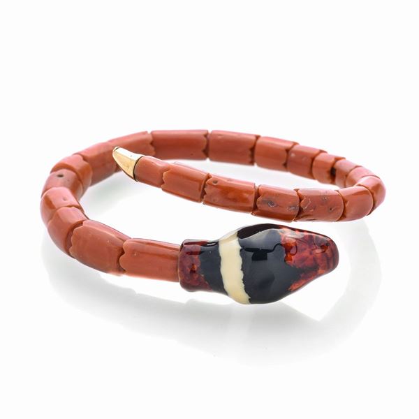 MATERIAL: red coral, yellow gold and colored enamels DESCRIPTION: bracelet made like a snake with a later age head in 750 yellow gold, enamel in shades of red, cream and black and red coral barrel body, final part of the tail in yellow gold MEASUREMENTS: internal diameter 5.5 / 6 cm WEIGHT: 35.8 g