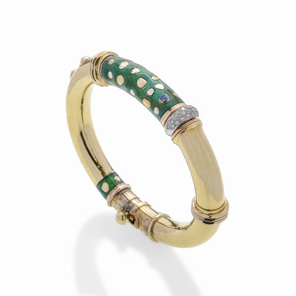 MATERIAL: yellow gold, green enamel and diamonds DESCRIPTION: large rounded rigid bracelet in plain gold embellished with spotted inserts in green enamel and gold, embossed motifs in yellow and white gold rings, the latter decorated with a pavè of brilliants, signed Nouvelle Bague, bears the 750 and 18k hallmarks MEASUREMENTS: inner diameter 6 cm WEIGHT: 55.3 g