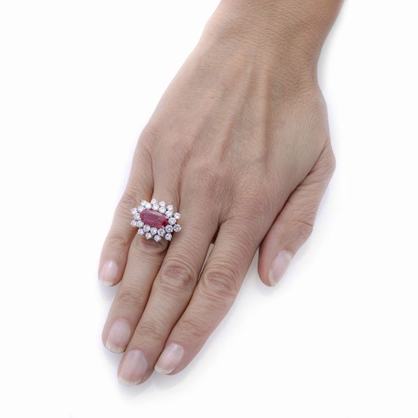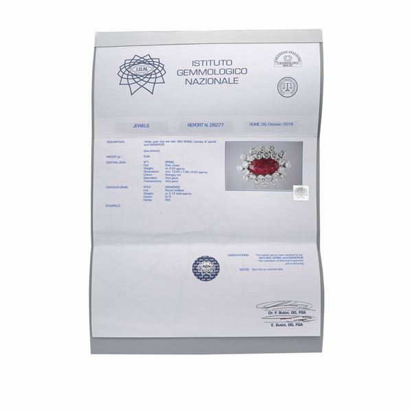 MATERIAL: white gold, diamonds and natural pink spinel DESCRIPTION: ring made with oval cut pink spinel embellished with two bands of brilliant cut diamonds arranged in a staggered manner MEASUREMENTS: ring 14 WEIGHT: natural pink spinel ct 4.30, diamonds ct 3.15, color G-H, purity VVS, gr 7.0, accompanied by certificate IGN Rome n.26277 of 08.10.2018