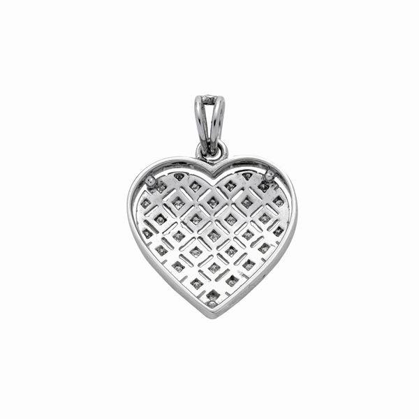 MATERIAL: white gold and diamonds DESCRIPTION: heart shaped pendant, executed in tricot and embellished with brilliant cut diamonds MEASUREMENTS: cm 2.5 x 3h WEIGHT: gr 6.6