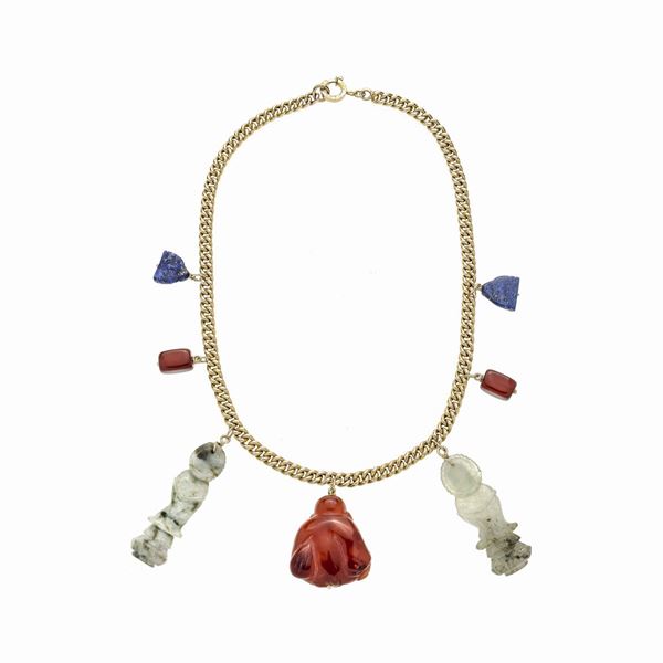 MATERIAL: yellow gold, carnelian, jade and lapis lazuli DESCRIPTION: necklace made with a barbican-link chain with chiselled clasp embellished with seven pendants in semi-precious stones, five of which are carved to represent the Buddha in the standing position or seated in the lotus position MEASUREMENTS: necklace open cm 41 WEIGHT: gr 57.7