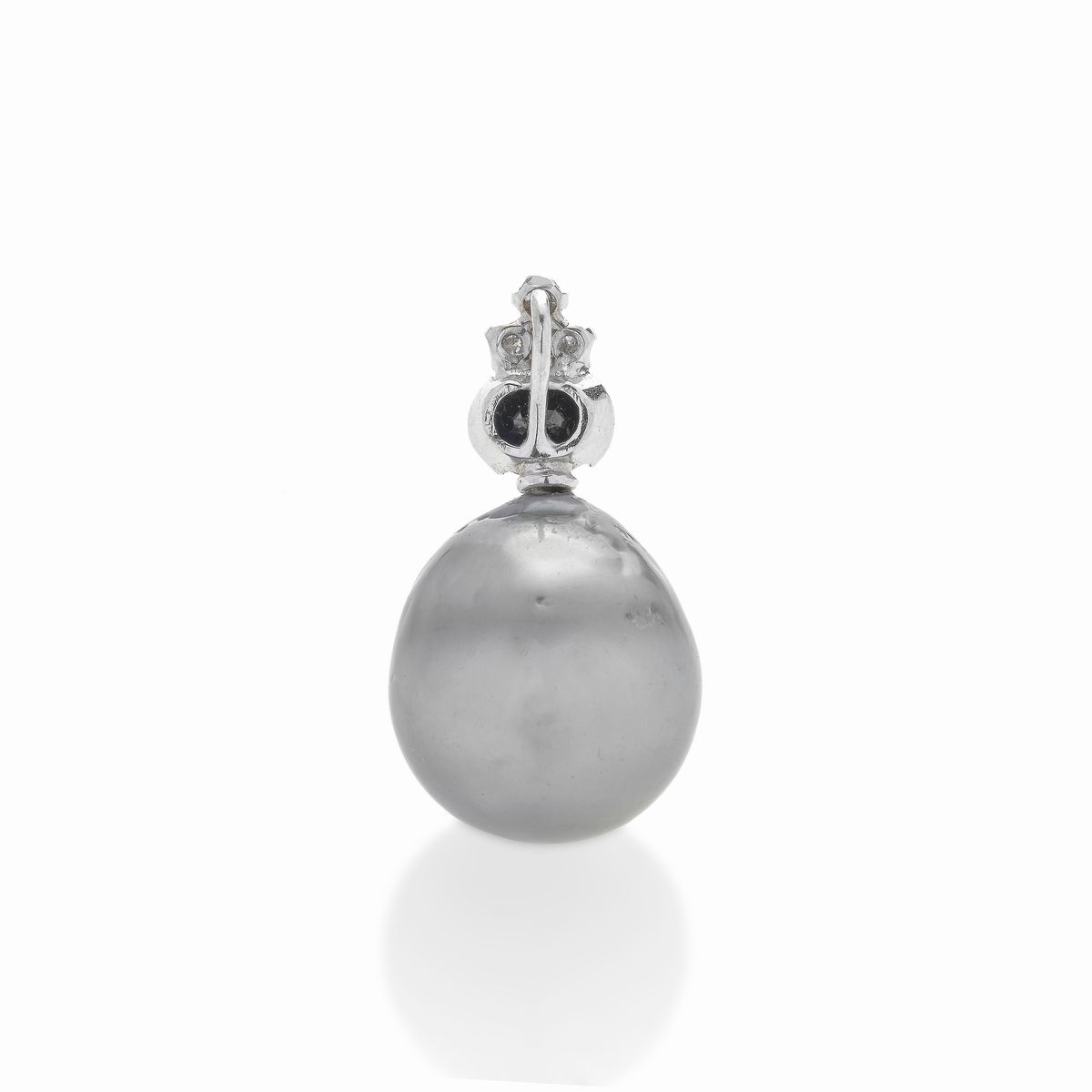 MATERIAL: white gold, Tahiti pearl, diamonds and sapphire DESCRIPTION: made with an oval-cut sapphire embellished with a trefoil motif, surmounted by a large Tahiti pearl with a slightly irregular shape MEASUREMENTS: pearl cm 1.5x1.7, pendant cm 1.5x2.8 WEIGHT: gr 6