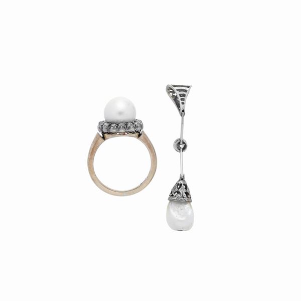 MATERIAL: platinum, gold low title, diamonds and pearls DESCRIPTION: pendant made as a bar, partly tricot, embellished with two old-cut diamonds and pearl pendant and daisy ring made with pearl framed with old-cut diamonds, the latter bears engraved 08 MEASUREMENTS: pedant length 4.3 cm, ring 11 WEIGHT: gr 8.1