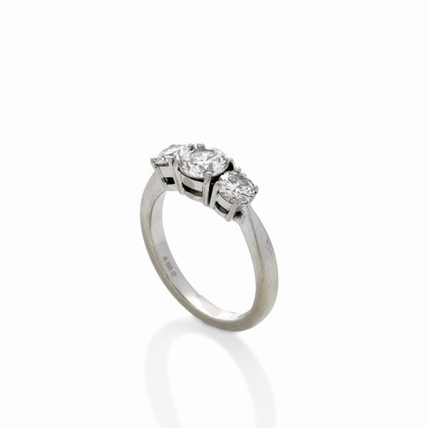 MATERIAL: white gold and diamonds DESCRIPTION: trilogy ring made with a brilliant-cut diamond in the centre and two others arranged on the sides, it bears the 750 mark, an external stone is broken MEASUREMENTS: ring 6.5 WEIGHT: central diamond ct 0.75, colour K, purity SI, laterals ct 0.30 and ct 0.34 colour J, purity VS, gr 4.5