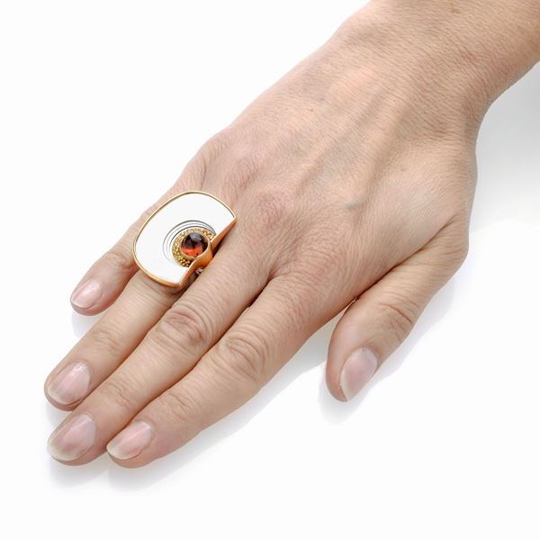 anello 15, diametro spilla cm 5.4DESCRIPTION: large circular brooch made with an oval-shaped serena stone in the center, on a white gold base with a yellow gold edge, signed Reister 73, bears the 750 mark and cocktail ring, modeled as a semicircle with round cabochon-cut amber, framed with yellow gold microbeads, on a white gold base with yellow gold border, signed Reister 86, bears the 750 mark WEIGHT: 42.2 g