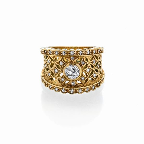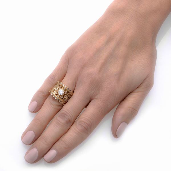 SIZE 7.5DESCRIPTION: tricot band ring in Florentine style, with old cut diamond in the centre, framed with other huit huit cut diamonds to embellish the links, high profiles also with huit huit cut diamonds WEIGHT: central diamond ct 0.60, color G, SI2 clarity, other diamonds ct 0.30, gr 13.4