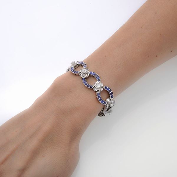open 18cmDESCRIPTION: bracelet made as a stylized ribbon entirely embellished with square cut sapphires alternating with links executed as stylized flowers, each of the latter embellished with a brilliant cut diamond, coronè roses and huit huit cut diamonds WEIGHT: sapphires ct 6.0, diamonds ct 2.80, H-I color, SI clarity, 36.9 g