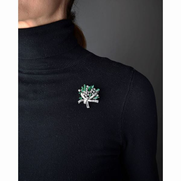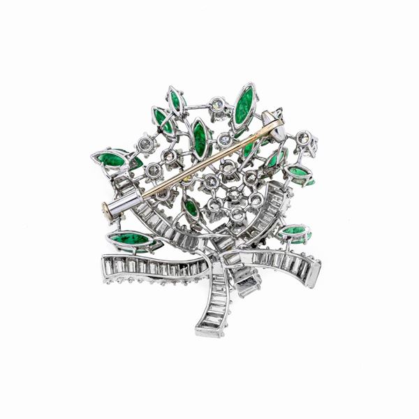 3.5x3.5cmDESCRIPTION: brooch modeled as a stylized bouquet of flowers decorated with baguette and brilliant cut diamonds and marquise cut emeralds WEIGHT: brilliant cut diamonds ct 1.60, G colour, VS clarity, baguette cut ct 2.70, G colour, VS clarity, emeralds ct 3.0, gr 11.6