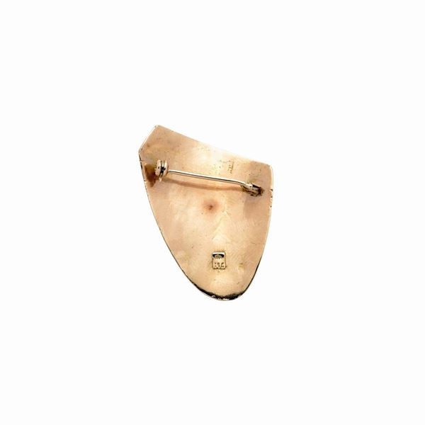 cm 2.8 x 4.2DESCRIPTION : brooch made like a shield partly in engraved gold, with Egyptian figures made in high relief, bears the 750 PESO mark. gr 9.3