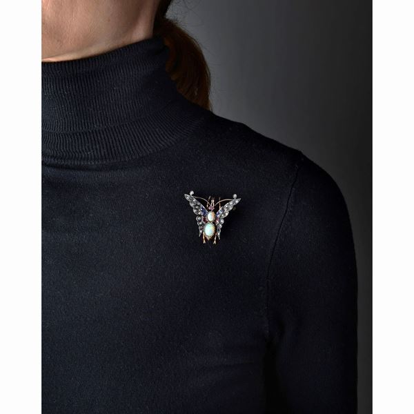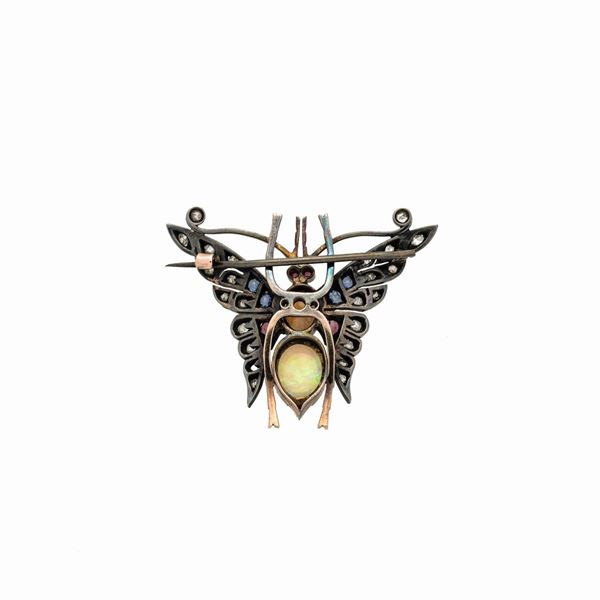 cm 4.5x3.5hDESCRIPTION: brooch shaped like a butterfly, the wings decorated with diamond roses, rubies and sapphires, the body formed by two oval cabochon cut opals WEIGHT: opals ct 0.90 in total, diamonds ct 0.50, sapphires and rubies ct 0.60, gr 10.7