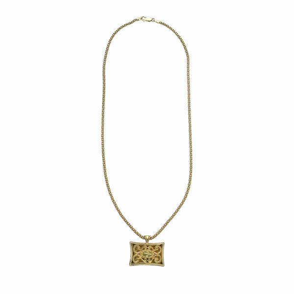 open length 45 cm, pendant 2.5x2.2 cmDESCRIPTION: the chain made of perforated tubular mesh, the rectangular pendant embellished with an oval cabochon coral, bears the gold hallmark and the F. Pannacci signature WEIGHT: 16.3 gr