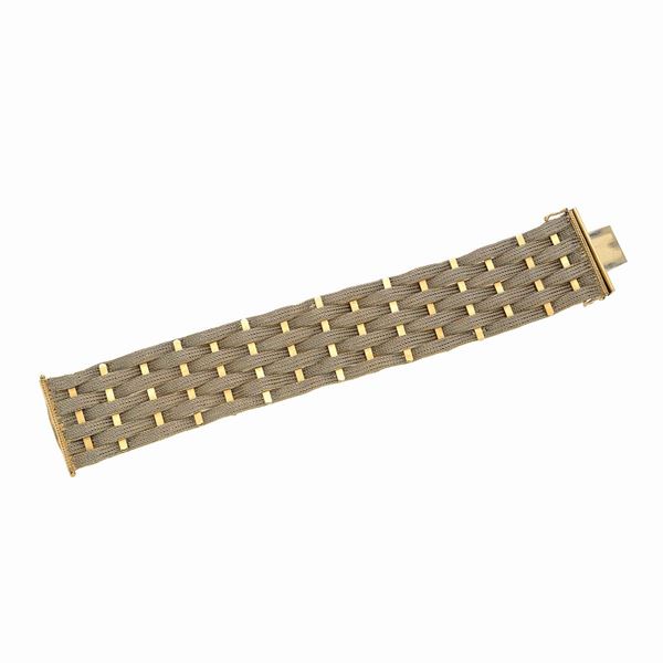 open 18.5 cmDESCRIPTION: bracelet in yellow gold, made with links in imitation of the fabric, arranged alternately so as to form a weave similar to trimmings, bears the 750 mark WEIGHT: 64.7 g