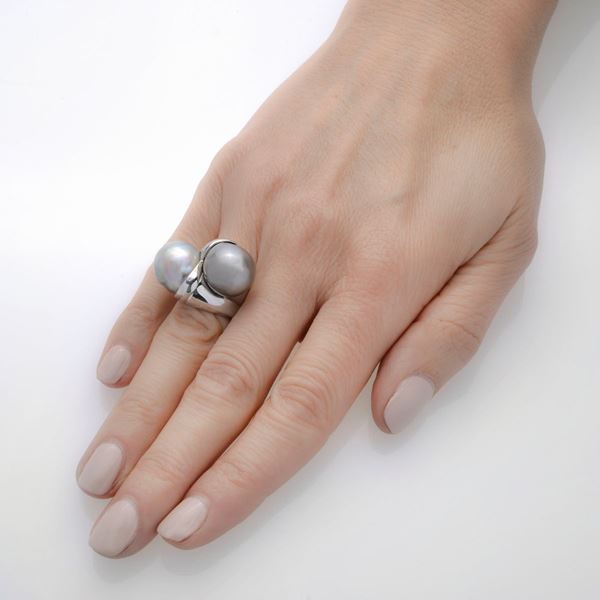 SIZE 6.5DESCRIPTION: large contrarie ring made with two gray Australian pearls, bears the 750 mark WEIGHT: pearls diameter 13 mm, 19.8 gr