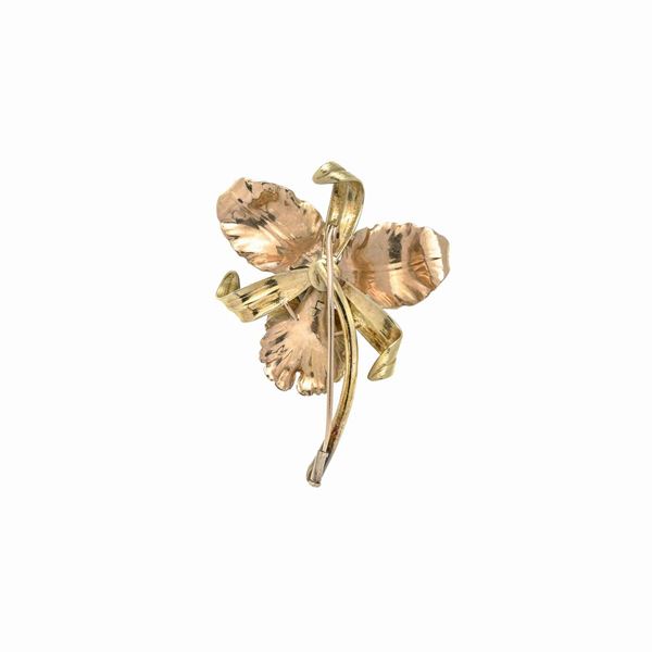 5 x 6.5 cmDESCRIPTION: brooch realistically modeled like an orchid in satin gold embellished with three old cut diamonds WEIGHT: 19.1 gr