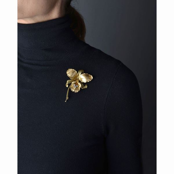 Large Orchidea brooch in i8 kt yellow gold and diamonds