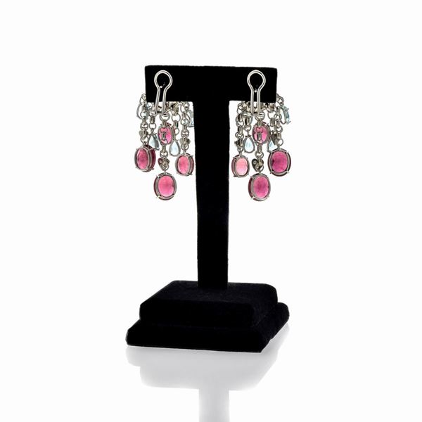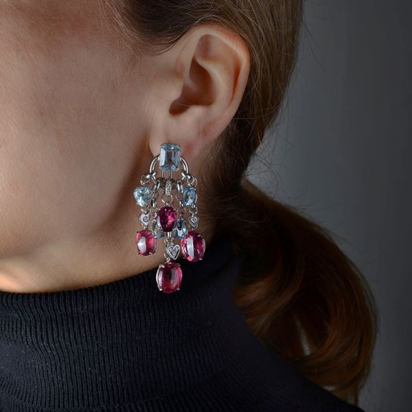 Pair of 18 kt white gold, diamond, aquamarine and pink tourmaline pendant earrings