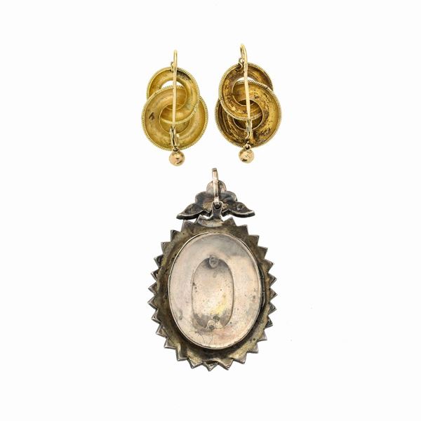Pair of 18K yellow gold and garnet earrings and keepsake pendant