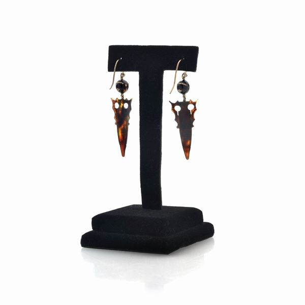 length 5.5 cmDESCRIPTION: each earring made with a small tortoiseshell sphere, decorated with applied gold hemispheres, from which an amphora is suspended, also in tortoiseshell, similarly decorated WEIGHT: 2.8 gr