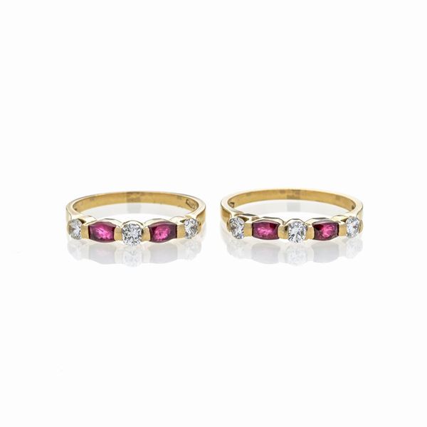 Pair of rings in 18k yellow gold, diamonds and rubies