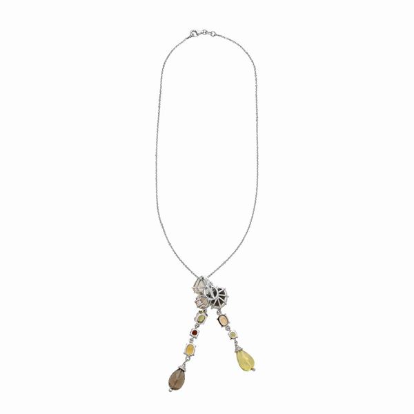 pendant cm 2 x 7 hDESCRIPTION: long pendant made with a series of different colored and fancy cut quartzes, accompanied by a white gold chain, bears the 750 mark WEIGHT: 14.0 gr