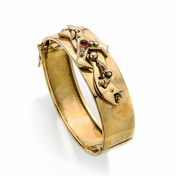 closed internal diameter 6.4 cmDESCRIPTION: rigid bracelet made with a stylized motif embellished with micro-pearls and red stone, slight dents WEIGHT: 20.5 gr