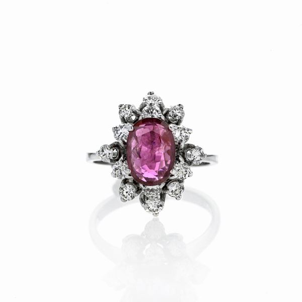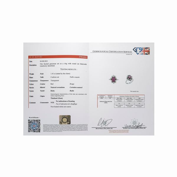 SIZE 6DESCRIPTION: ring decorated in the center with an oval cut ruby set in a brilliant cut diamond frame WEIGHT: ruby ct 1.45, with Gemmological Certification Service London certification n. 5782-2663 dated 08.01.22, diamonds approx. 0.60 ct, 4.5 gr