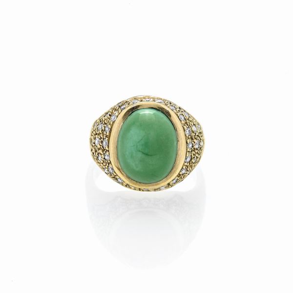 SIZE 6DESCRIPTION: ring made with oval cabochon cut turquoise on a high base embellished with brilliant cut diamonds, bears the 750 mark WEIGHT: 12.5 gr