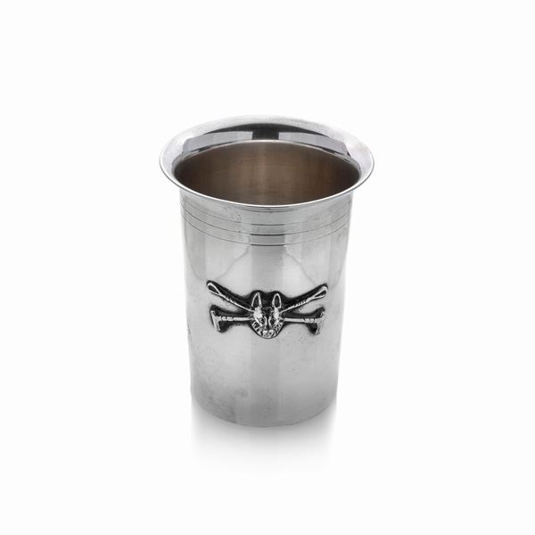 glass h cm 10.1DESCRIPTION: set of twelve silver vermeille tea spoons, Denmark, each embellished with polychrome enamels in shades of white, blue, yellow, green, red and light blue, with red case, slight drops to the enamel, and silver glass, inspired by the fox hunting, Gucci WEIGHT: glass 151.6 gr