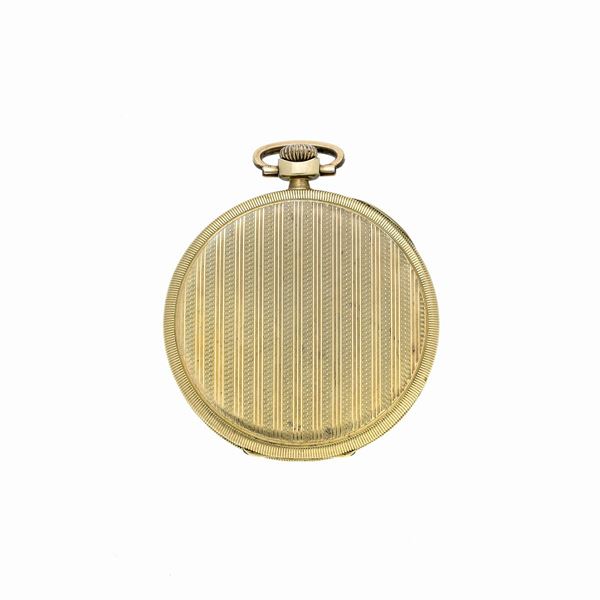 case diam. 47mmCASE: in brushed gold engraved with stripes, side finely chiseled with plant motifs, winding crown at 12 o'clock DIAL: silver with Breguet Arabic numerals, auxiliary dial for the seconds at 6 o'clock, openworked hands MOVEMENT: manual winding WEIGHT: gr 60.6