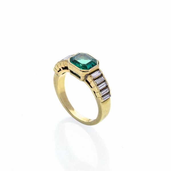 SIZE 15Ring with octagonal emerald weighing approx. ct 1.60 and baguette-cut diamonds weighing approx. 0.85 ct, color G/H clarity IF/VVS with IGN Rome certification, Report n. 33545 of 11/4/23