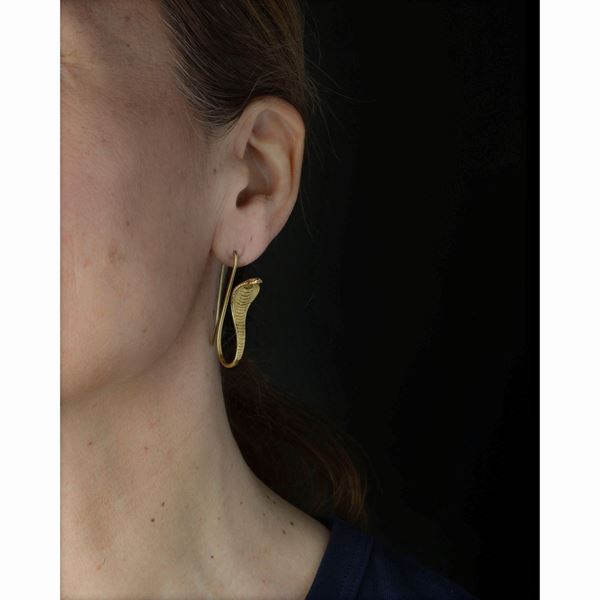 Pair of pendant earrings in 18 kt gold realistically shaped like a snake, 9.0 gr