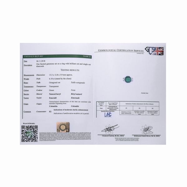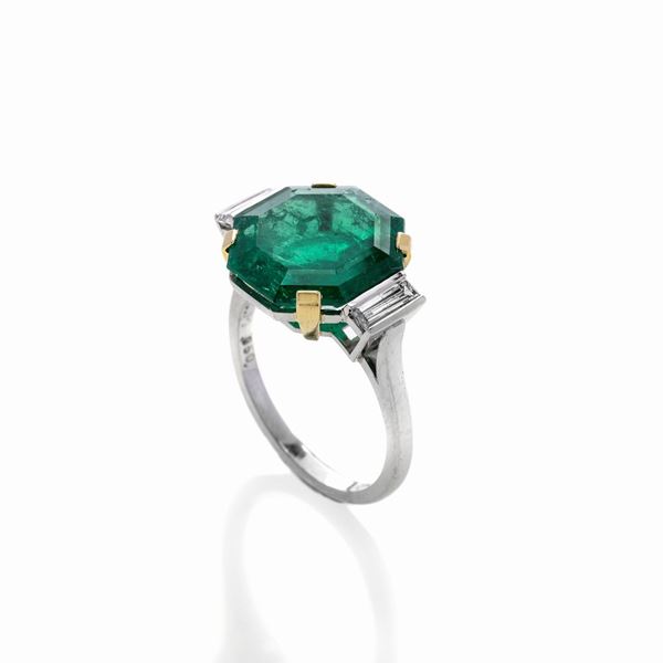 SIZE 6Ring with two baguette-cut diamonds weighing 0.40 ct and octagonal-cut emerald weighing 6.18 ct, accompanied by the Gemmological Certification Service, London, no. 79188-32 of 11.26.2018, bears the 950 mark, 6.6 gr