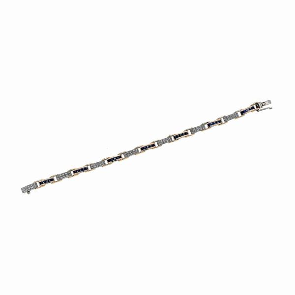 The bracelet made of elongated links embellished with brilliant-cut diamonds of 1.40 ct, color H-I, SI, carrè-cut sapphires of approximately 1.50 ct, 19.8 g