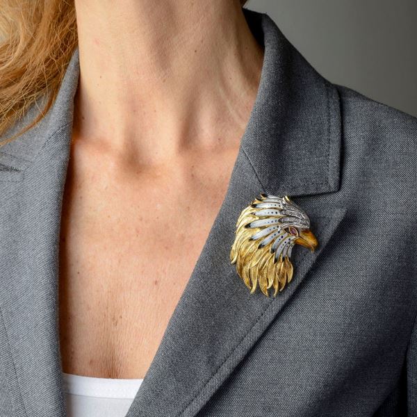 h 6.5 cm x 5 cmLarge brooch realistically modeled as an eagle's head, decorated with polychrome enamels, 0.50 ct brilliant-cut diamonds, color G-H, VS and 0.10 ct shuttle-cut ruby, 33.9 g