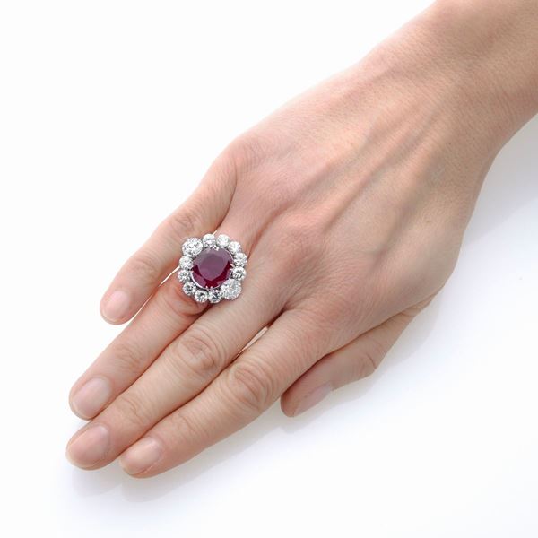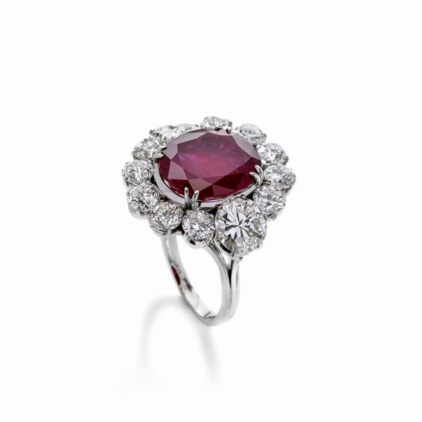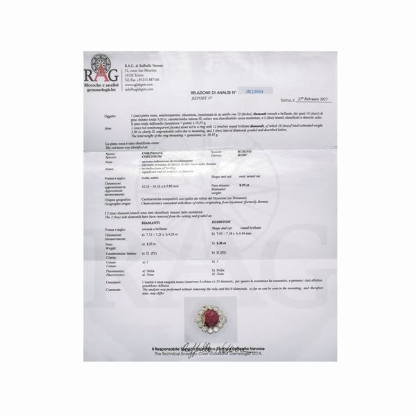 MEASURE 11Ring with oval cut ruby ct 8.95, two brilliant cut diamonds each respectively ct 1.27, color I, P2, and ct 1.36, color J, P2, four brilliant cut diamonds ct 0.30 each, color I, VS, six brilliant cut diamonds ct 0.25 each, color I, VS, accompanied by R.A.G. Turin no. JR23004 dated 02.27.2023, gr 10.6
