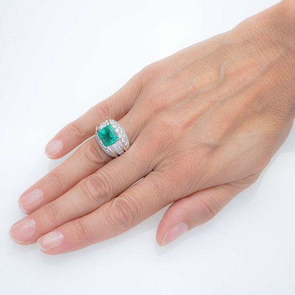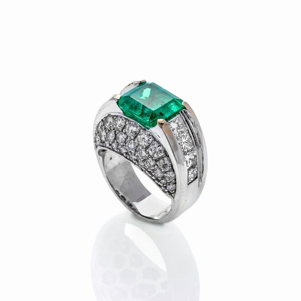 Large ring in white gold, diamonds and emerald