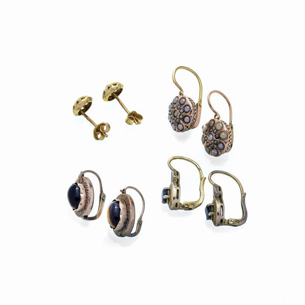 Lot of four pairs of earrings in 18 kt yellow gold, 9 kt gold and stones