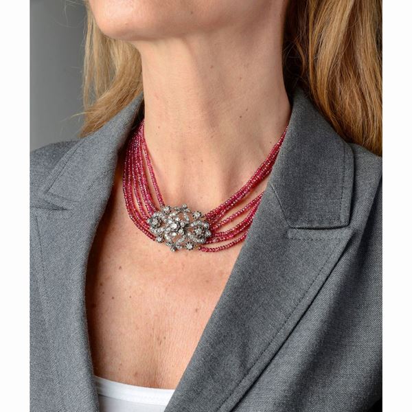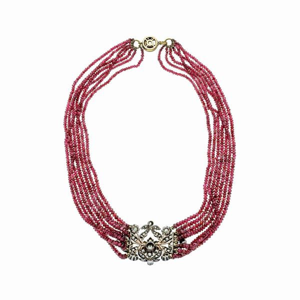 open, length 45 cm, central element 5.5 h x 4.2 cmNecklace with seven strands of faceted rubies placed in gradation, in the center a floral-inspired element decorated with old cut diamonds for 3.70 ct, color J, clarity SI, 48.6 g