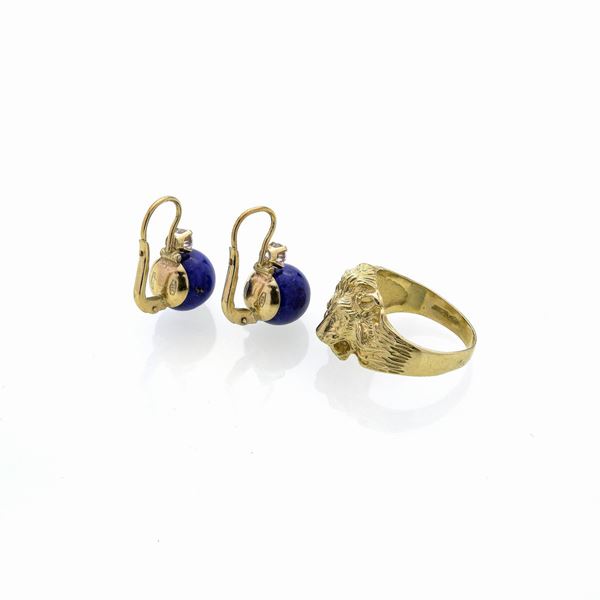 Necklace and pair of earrings in yellow gold and lapis lazuli and Lion Head ring