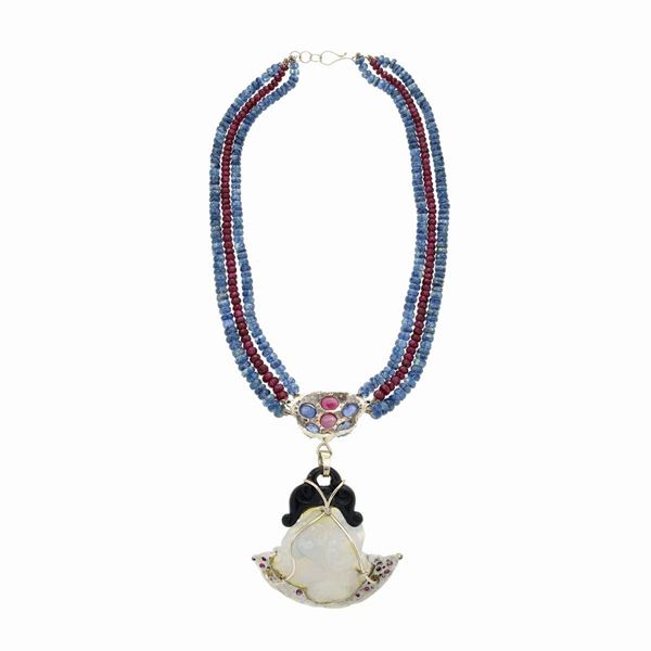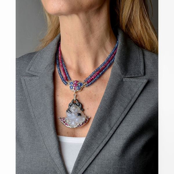 length 42 cm, pendant length 6.5 cmThree-strand necklace of faceted rubies and sapphires, with central element embellished with cabochon-cut rubies and sapphires and small diamonds, 18 kt white gold pendant with carved diamonds, rubies, onyx and chalcedony, 109.4 g