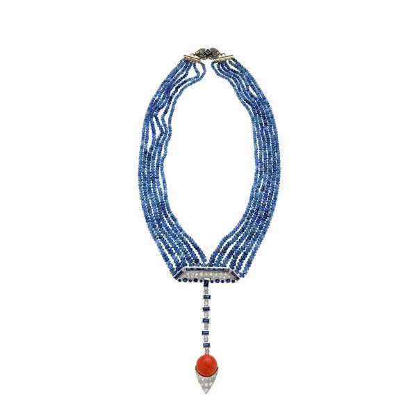 open length 40 cm, pendant length 8.5 cmNecklace with six strands of faceted sapphires with central pendant element decorated with old cut and huit-huit diamonds for approximately 0.50 ct, round cabochon cut sapphires and salmon coral diam. 15 mm, bearing the 750 mark, firmness in low title gold and silver, 72.8 g