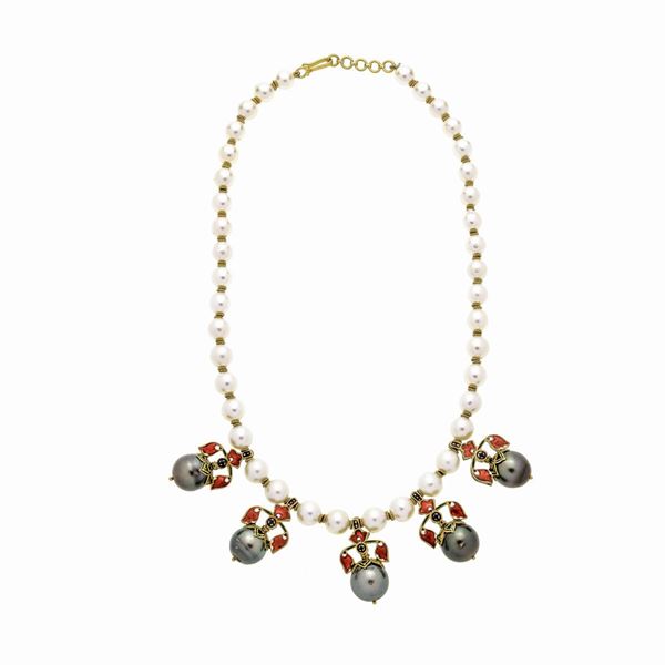 Necklace of white and gray Tahitian cultured pearls, 18 kt gold, diamonds and enamel