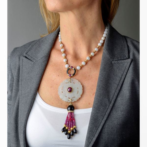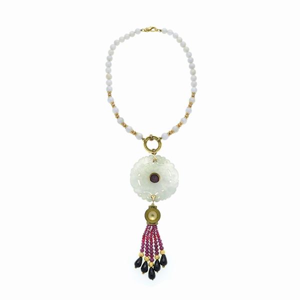 Necklace with large carved jade, in yellow gold, jade, rubies, diamonds and onyx