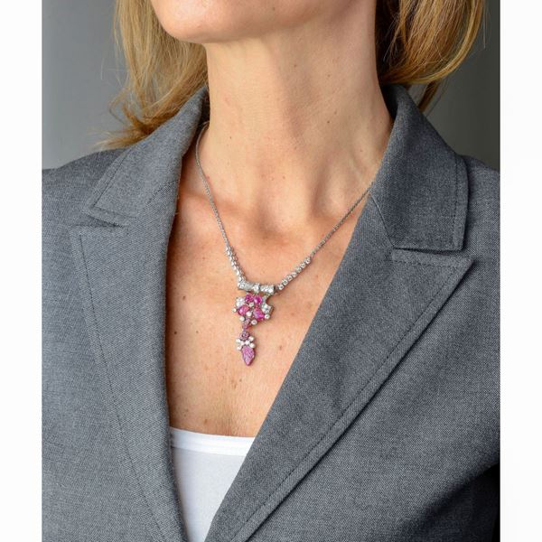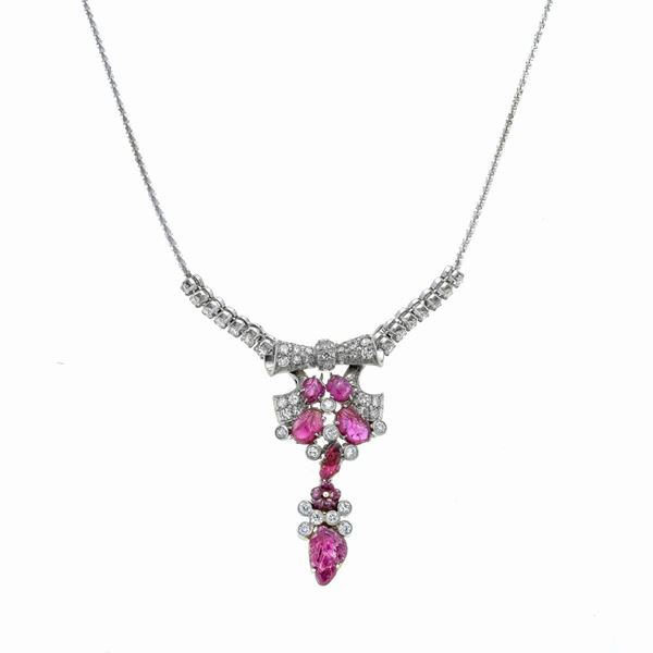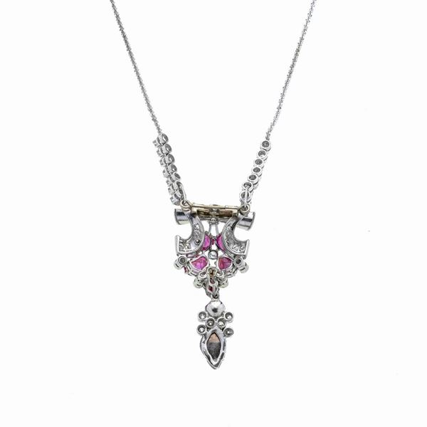 open 53 cm, length of pendant element 5 cmGold and diamond link necklace with clip transformed into a pendant, embellished with carved rubies and old-cut and huit-huit diamonds for 2.10 ct, the chain bears the 750 mark, one ruby has a break, 20.7 g