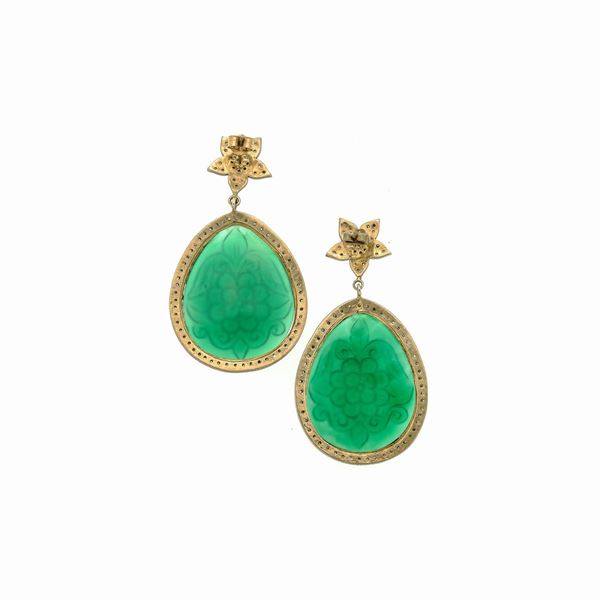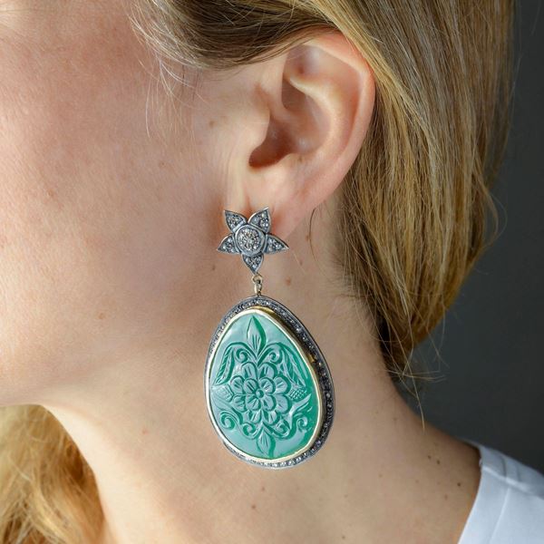 length 7.2 cmPair of earrings each made up of a star with diamond roses and a large drop in green agate engraved with flowers mounted within a diamond rose frame, 34.6 g