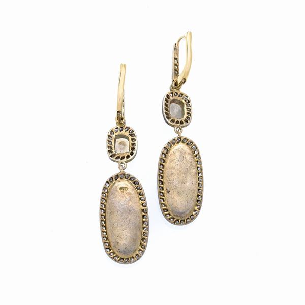 length 5.5 cmPair of pendant earrings made with two rectangular rose-cut diamonds totaling 1.60 ct and two oval fancy-cut tanzanites mounted within a frame of huit-huit cut diamonds, 10.2 g